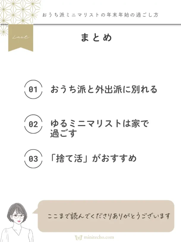 今回は「ミニマリストの年末年始の過ごし方」をテーマに、ミニマリストはおうち派・外出派に別れる、ゆるミニマリストは散財防止のため家で過ごす、ミニ活をするなら「捨て活」などがおすすめなことを紹介しました。
