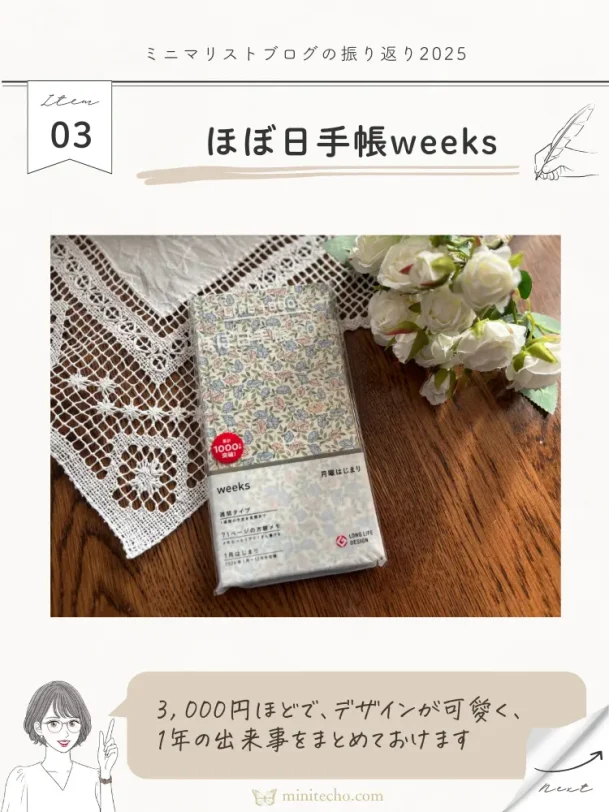 1年間の暮らしの記録と家計簿を1冊にまとめられます。浪費を振り返り、節約を意識することで、ミニマリストらしい暮らしの見直しができています。ほぼ日手帳weeksは愛用して5年以上経ちました。