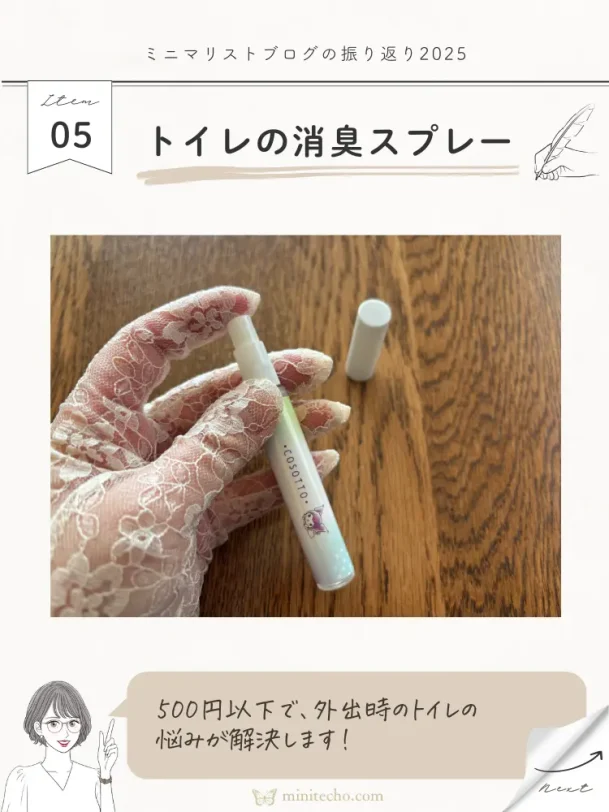 500円以下で買えるプチプラの消臭スプレーです。ミニマリストでも、外出時のトイレ悩みはつきもの。バッグに常備しています。かさ張らず、ナチュラルな香りで心地よい。