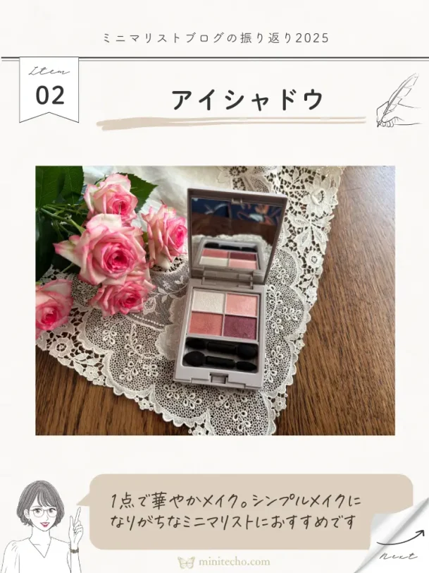 ミニマリストというと究極メイクをしない方もいらっしゃいます。詳しくは宇津木式スキンケアで調べてみてくださいね。メイクがシンプルになりがちなミニマリストでも、アイシャドウ一つで華やかになるため愛用しています。