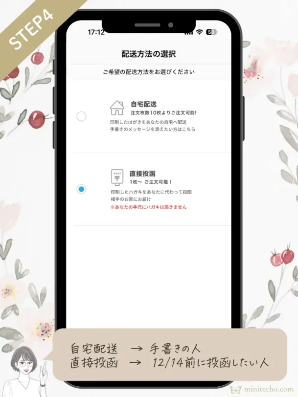 宛名ありにした場合、年賀状の配送方法をお好みで選べます。自宅配送と直接投函の場合で送料が違ってきます。