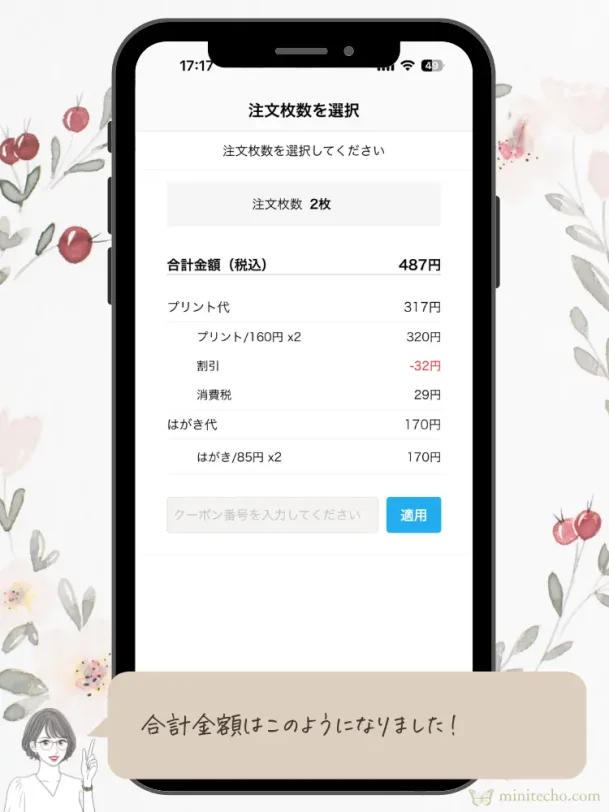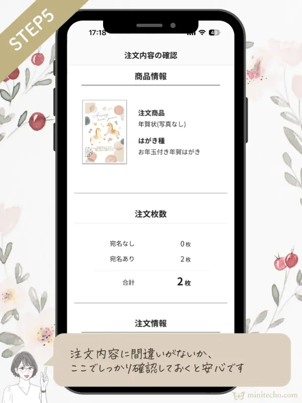 最後に注文内容を確認します。個人へ送るため、写真なしのデザインにしました。私の注文内容は次の通りです。