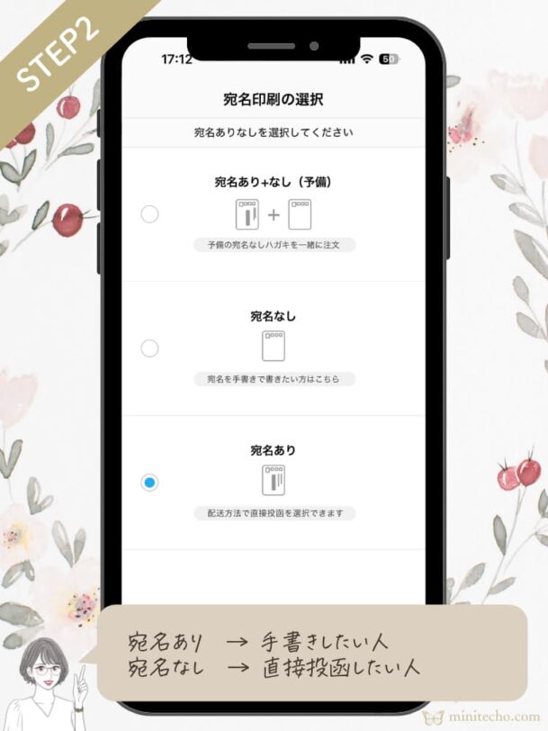 ミニマリストの私の場合は、直接投函をしてもらいたいため、宛名ありでお願いしました