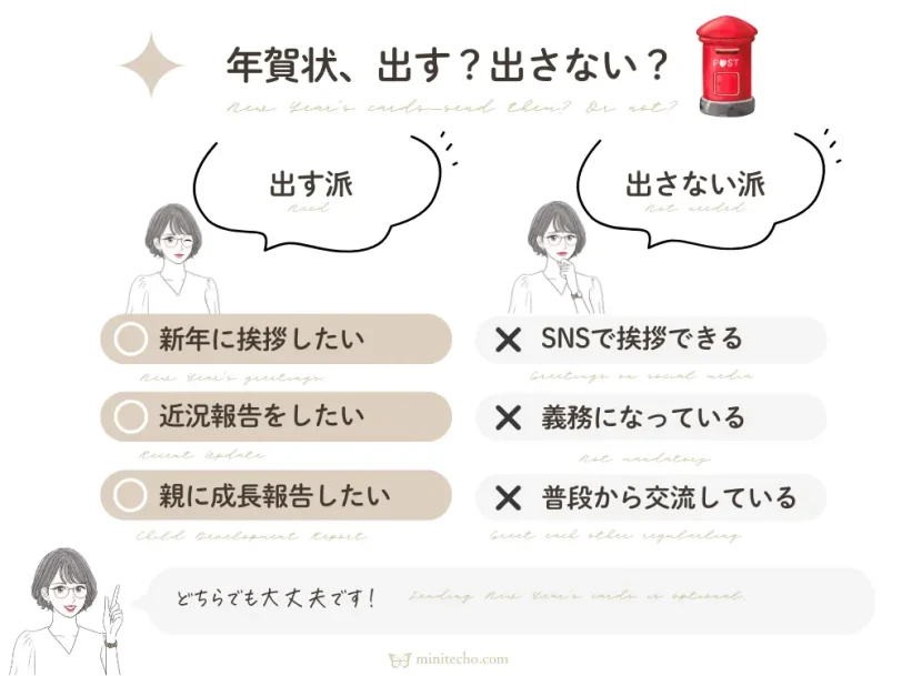 出す派の人は新年に挨拶したい人・近況報告をしたい人・親にこどもの成長報告をしたい人などです。一方出さない派は、SNSで挨拶する人・義務になっているのがいやな人・普段から知人と交流している人などです。